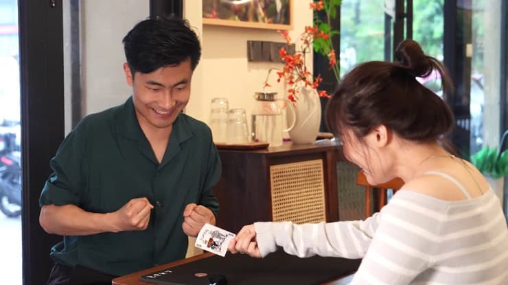 The magician shows two playing cards (Big Joker & Little Joker) and a coin, demonstrating how the coin vanishes and travels between the cards. When the spectator tries it themselves, the “magic” suddenly stops working. Just as everyone wonders what went wrong, the cards are turned over: the Little Joker has disappeared, leaving only a bicycle on his card… while on the Big Joker’s card, the Little Joker is now clinging tightly to the Big Joker, exchanging an awkward glance.
