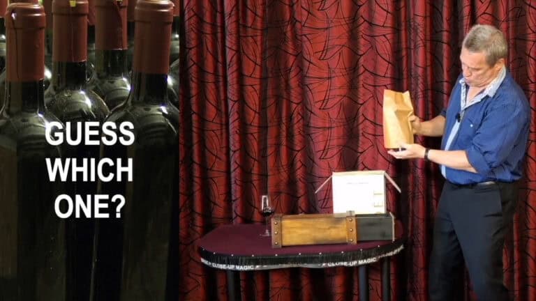 A spectator is invited to guess which bottle is removed from the carton (with a paper bag over it) placed into a wooden gift presentation box. Whatever the guess, the bottle vanishes completely.